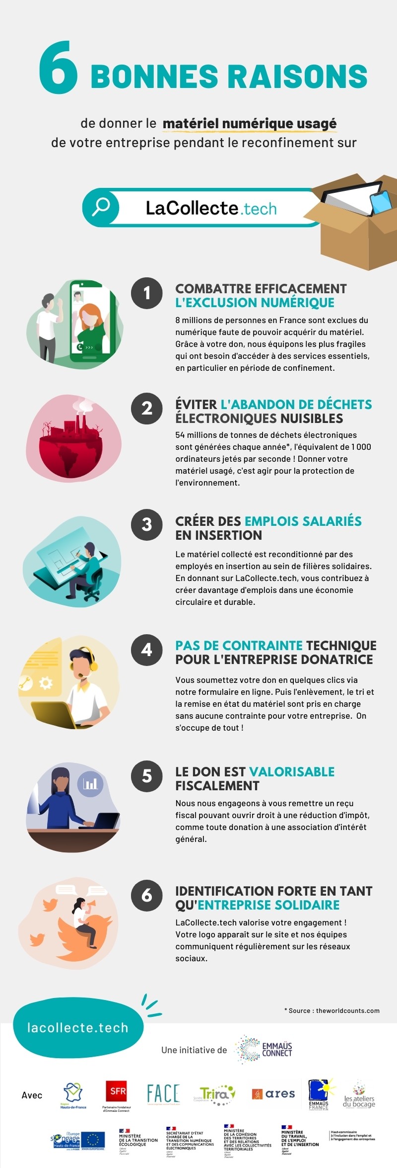 En partenariat avec Emmaüs Connect, FACE s’engage dans la campagne « La Collecte.Tech ».Ensemble et grâce aux dons de nombreuses entreprises et organisations, nous collectons, reconditionnons et redistribuons du matériel aux personnes en situation d’exclusion numérique.